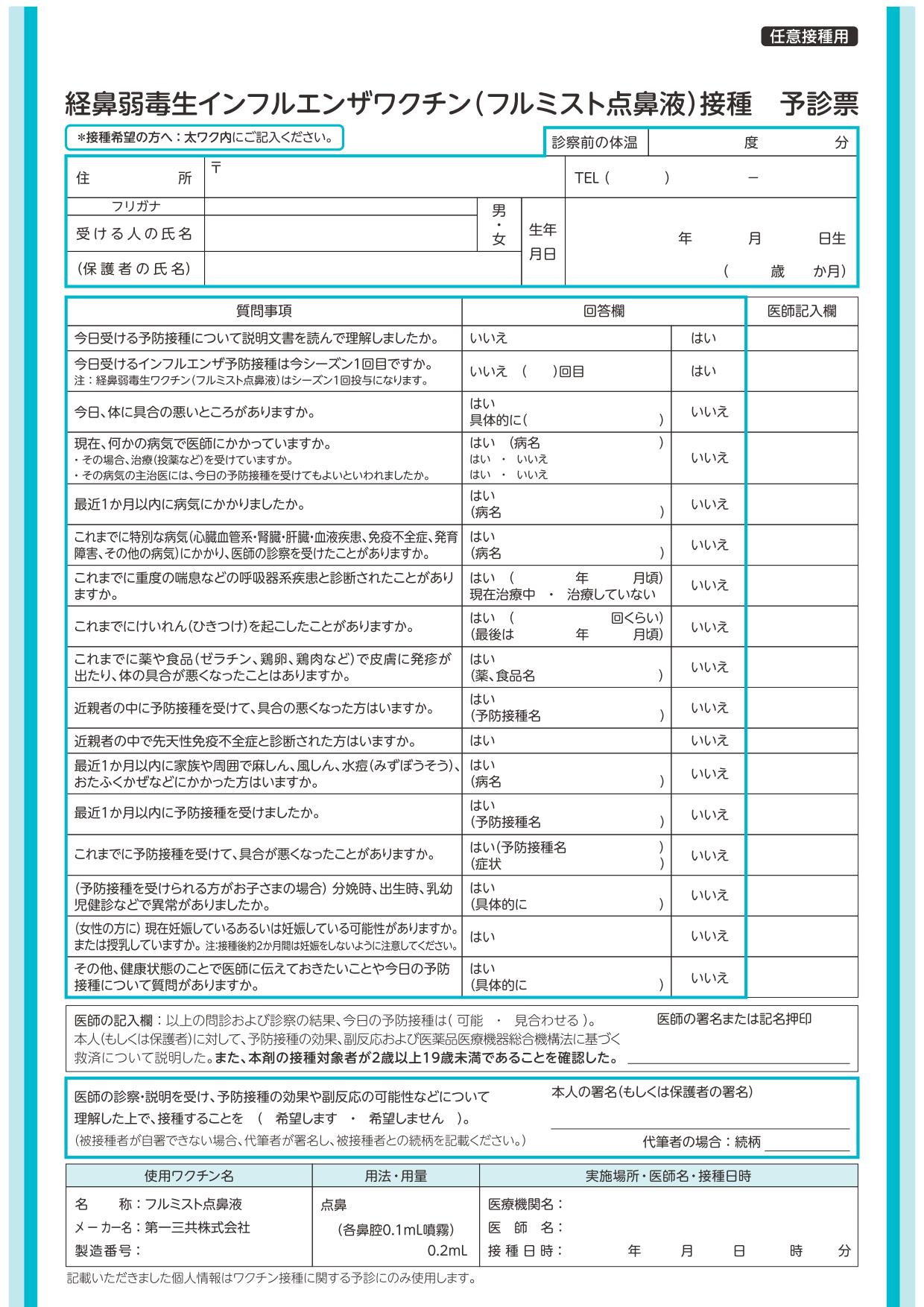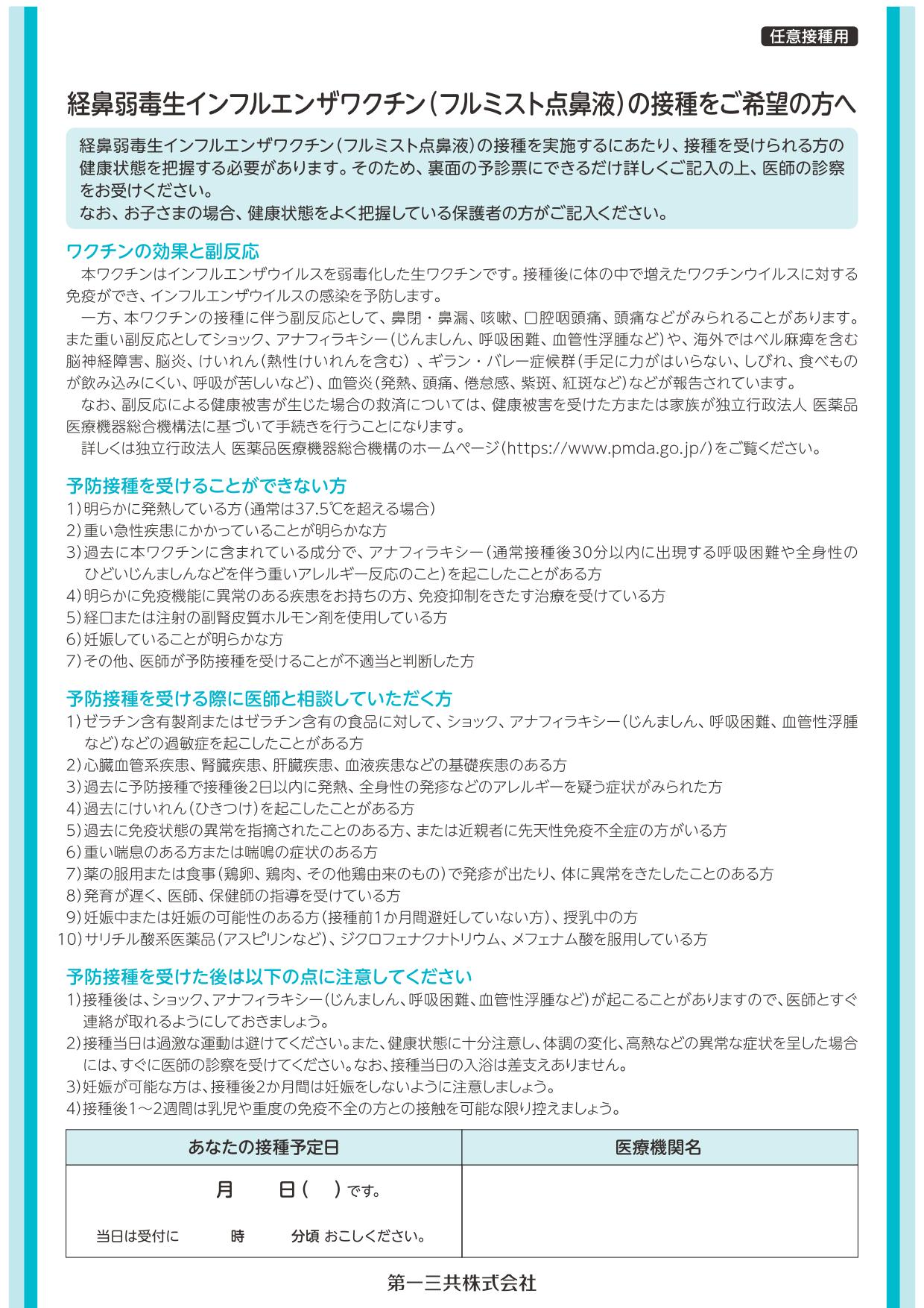 鼻に噴射するタイプのインフルエンザワクチン(フルミスト)を10月1日~11月30日に実施いたします。